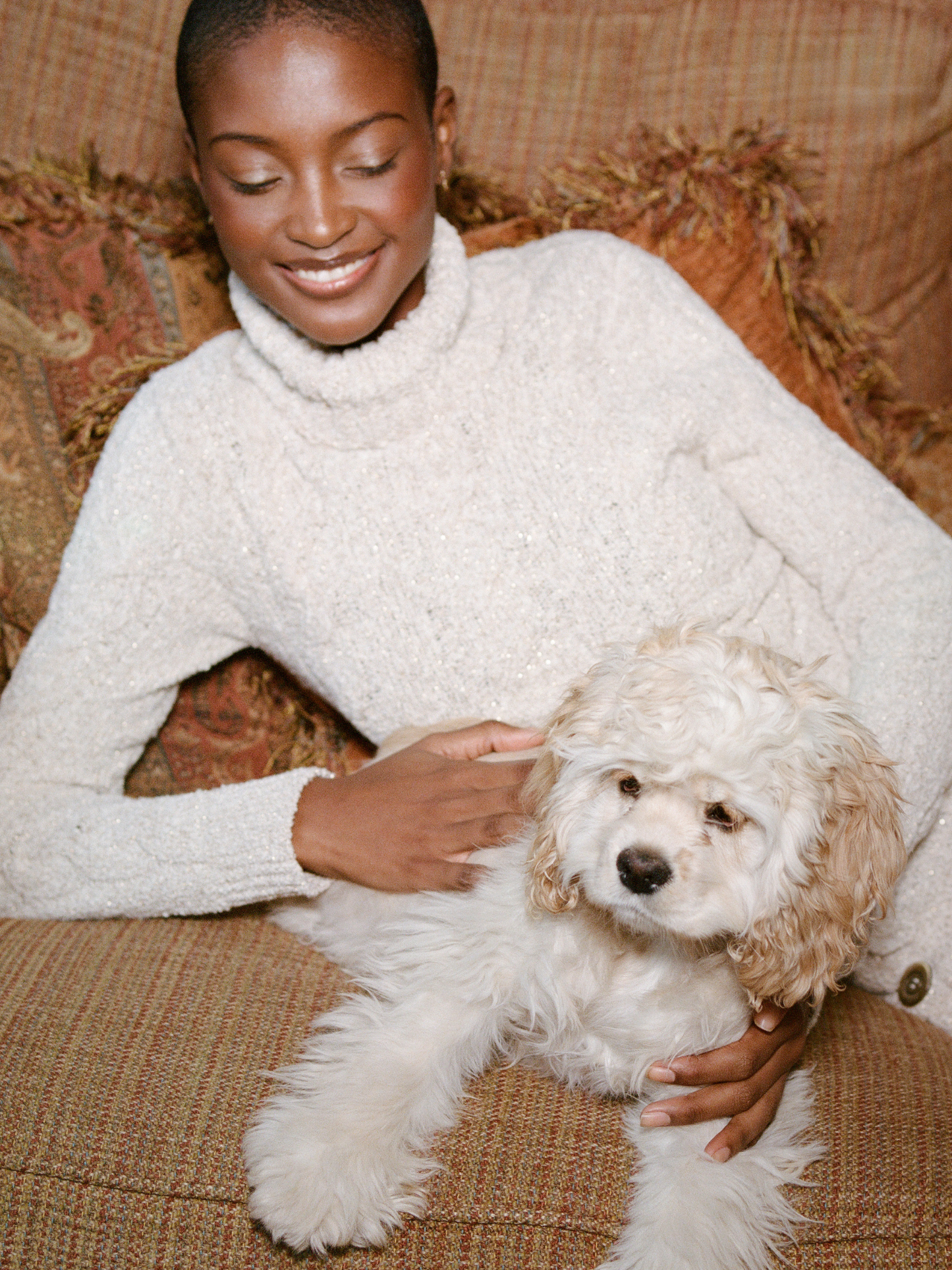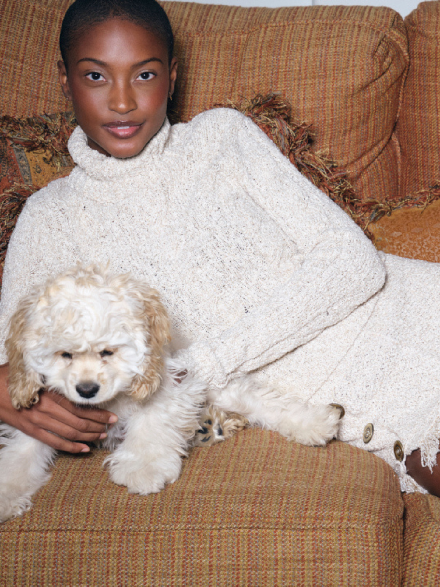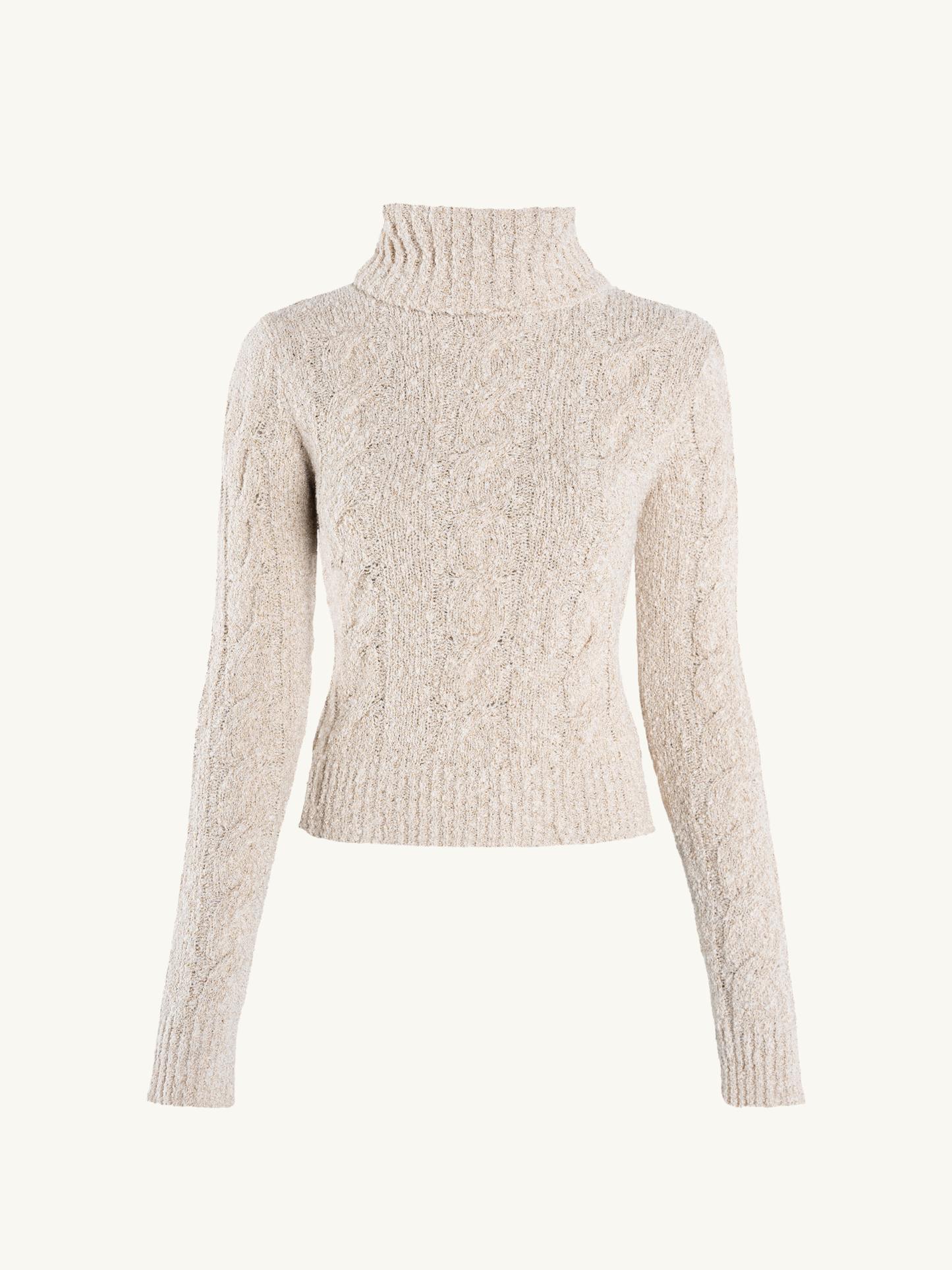 A cozy cotton based roll neck knit pullover from "THE GETAWAY" Resort '25 collection, blended with fine ends of gold lurex for a subtle holiday sparkle.