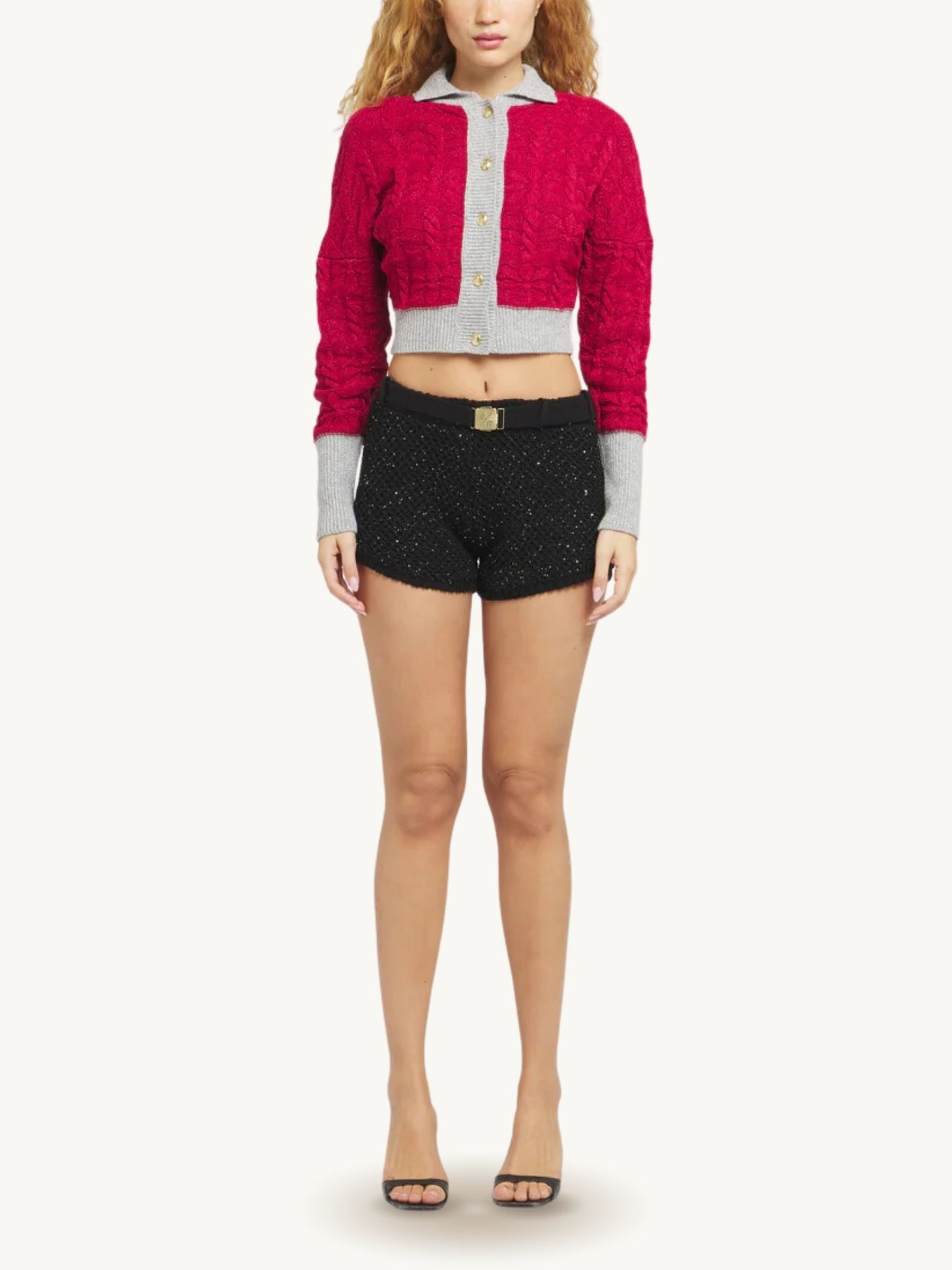 The classic cable-knit cardigan is reimagined with silver contrast detailing and gold-tone buttons. With a fitted silhouette, ribbed collar, cuffs, and hem, the Bella Cardigan brings a touch of vintage charm to modern styling—the perfect piece for layering in Fall.