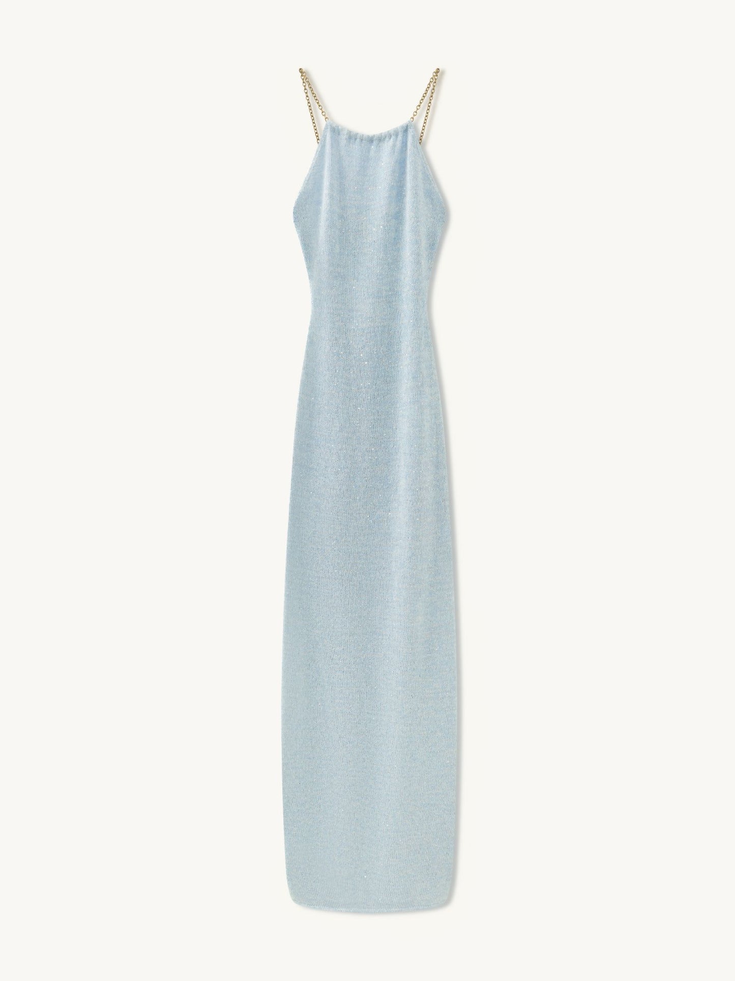 Crafted from signature paillette knit, this dress catches the light with every movement, offering a subtle sparkle. The sleek, figure-hugging silhouette is enhanced by delicate gold chain straps, combining texture and shine.