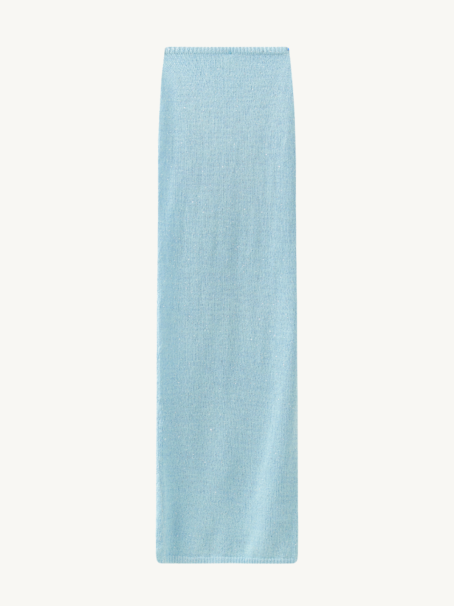 A scintillating floor length skirt made from a luxurious cotton-based knit with micro sequins woven throughout. Semi-sheer.