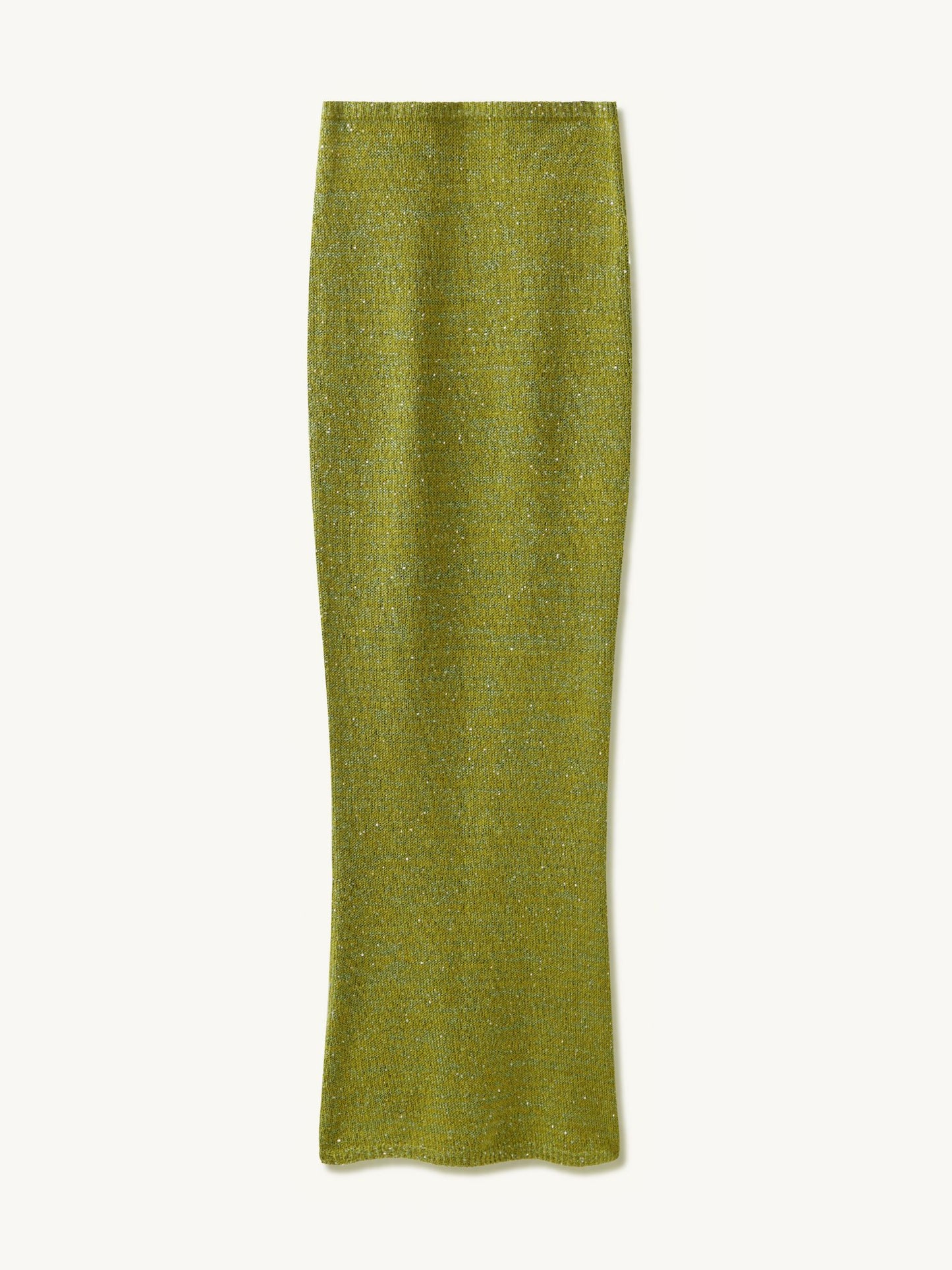 A scintillating floor length skirt made from a luxurious cotton-based knit with micro sequins woven throughout. Semi-sheer.