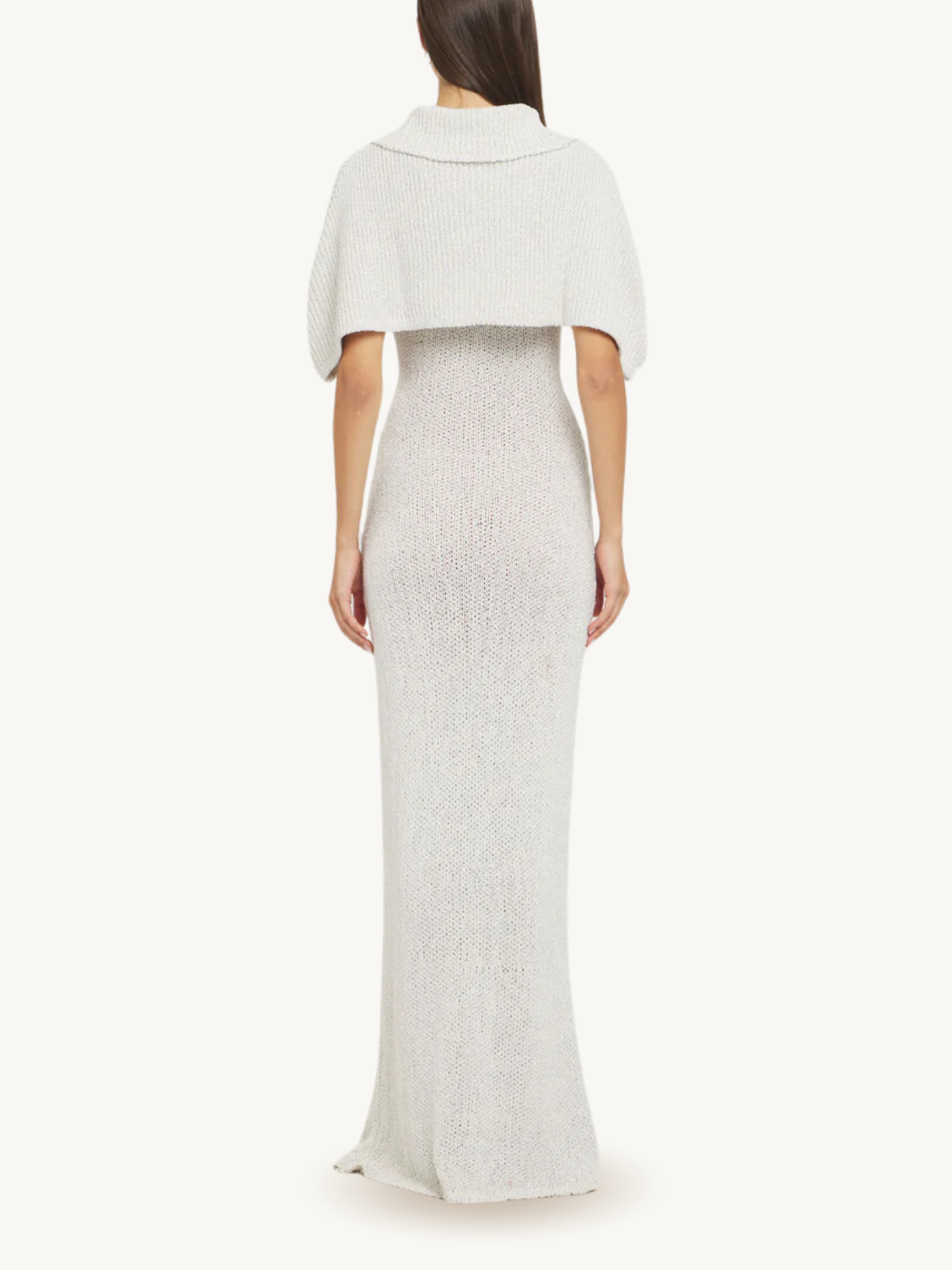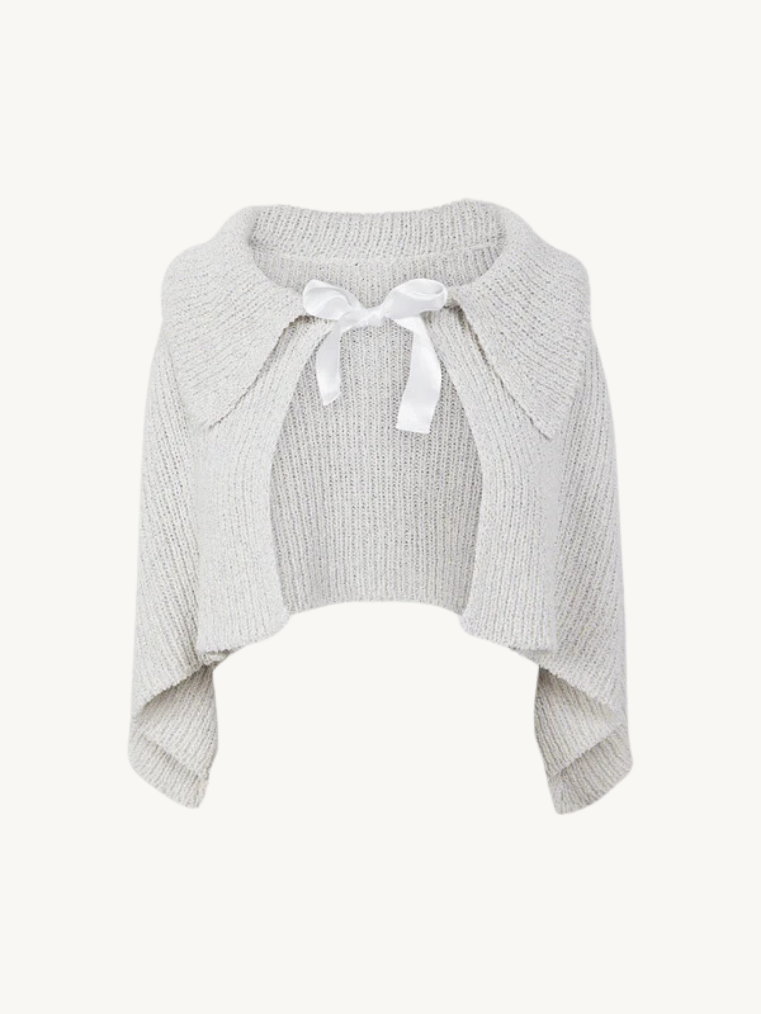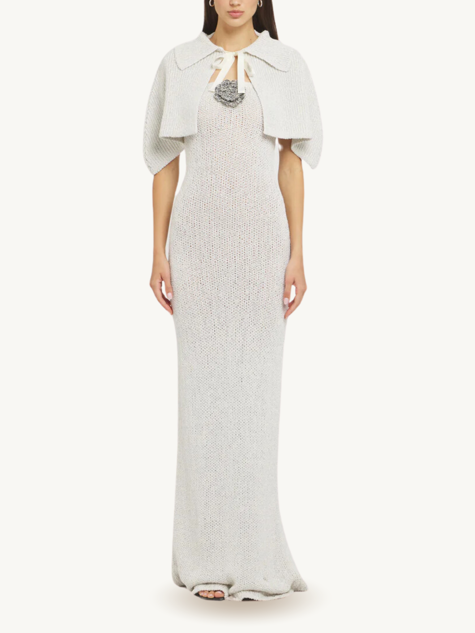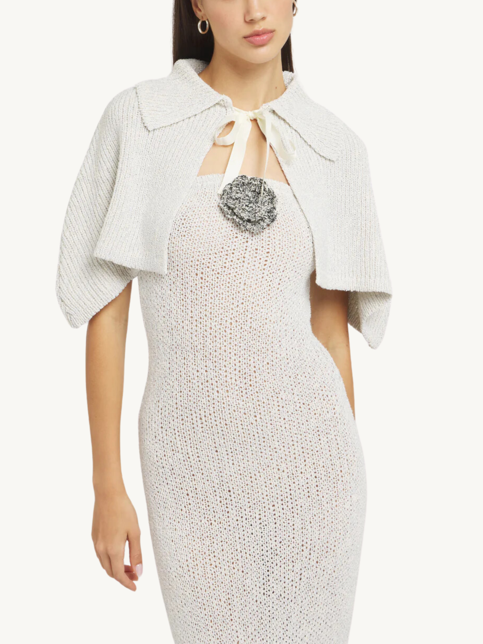 The classic shoulder cape gets a shimmering twist, with our lurex-spun pearl toned yarn. The shawl is completed with a full collar and an ivory satin tie-up bow.