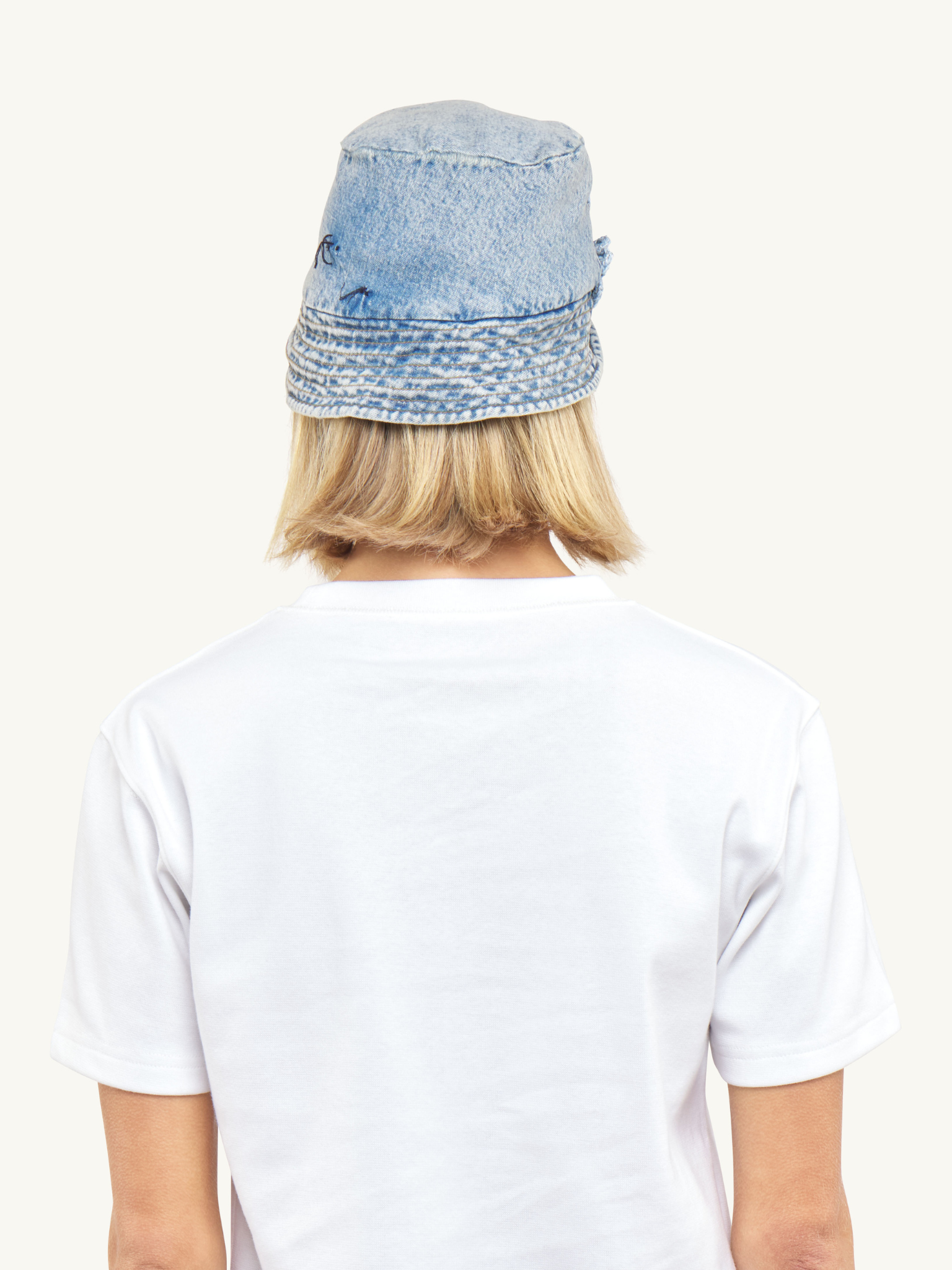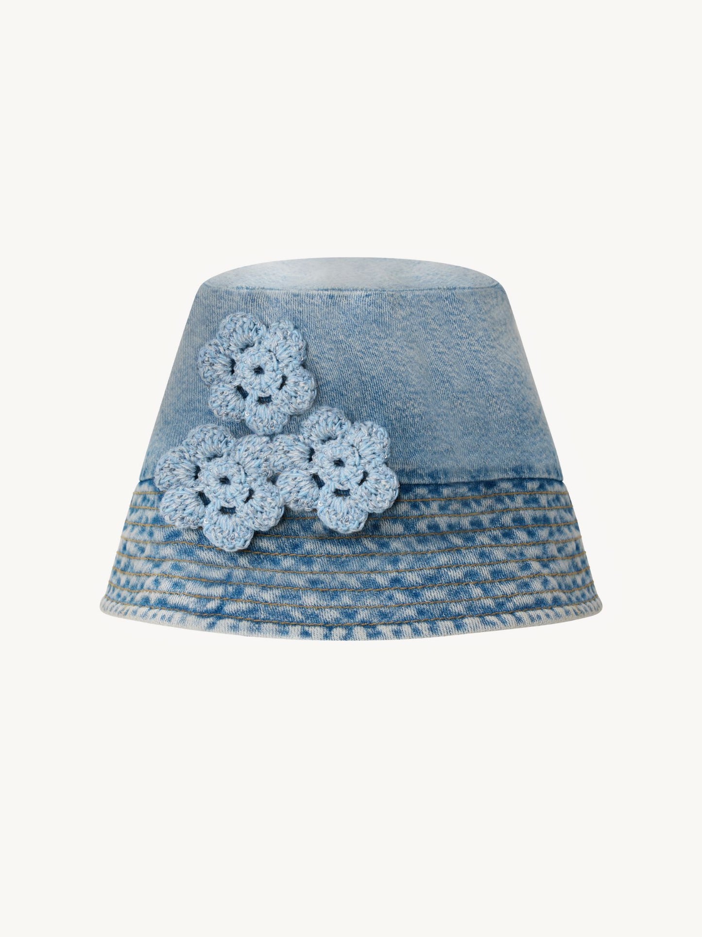 Made from soft, lightweight denim, a classic bucket shape with a vintage-inspired touch. Adorned with crocheted flowers in a soft blue, combining casual comfort with a distinctive look that pairs well with both casual and dressier outfits.