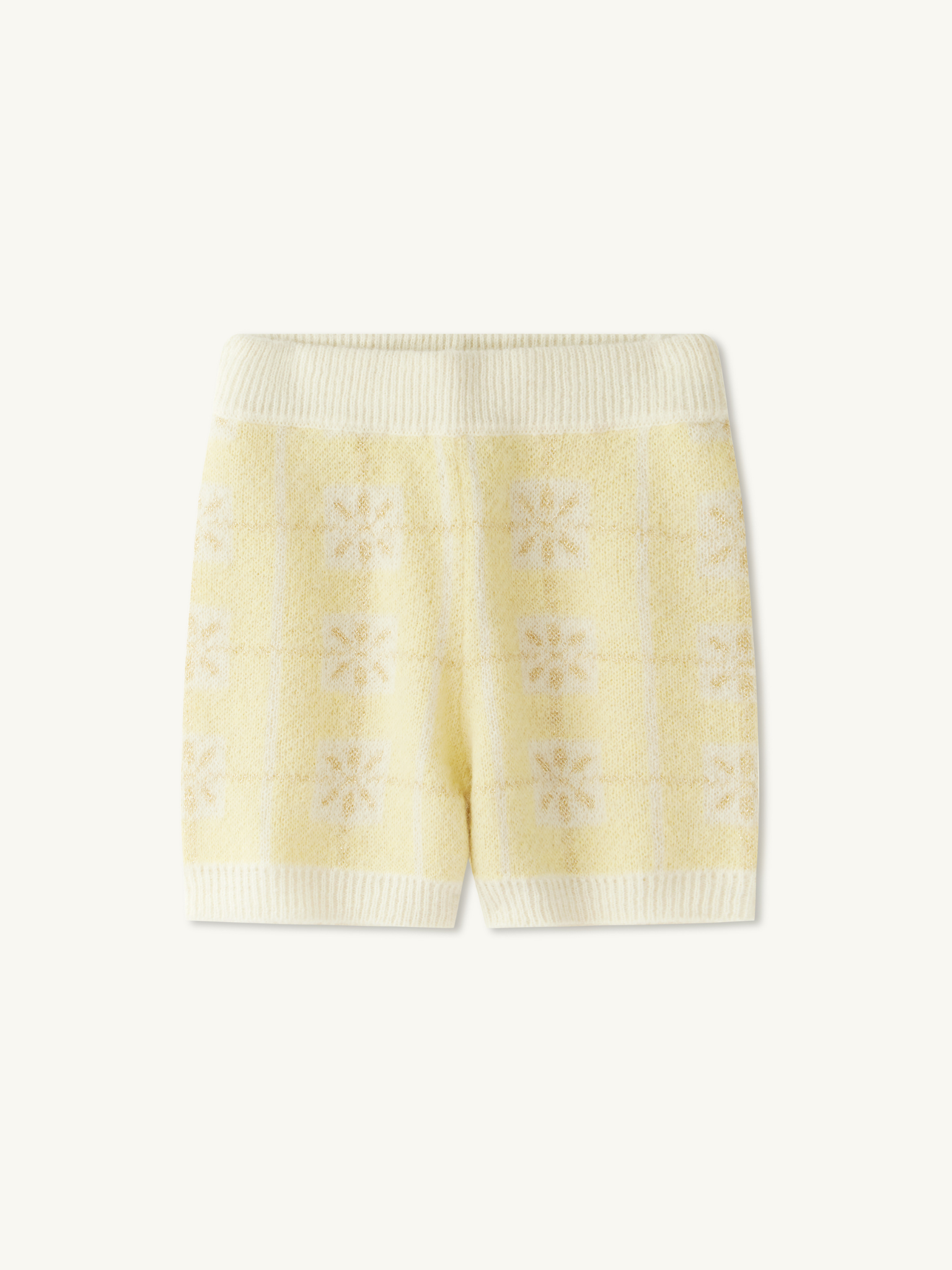 This playful, mid-rise short features a retro-inspired geometric jacquard pattern, perfectly complementing the Gigi Sweater for a cozy Spring ensemble.