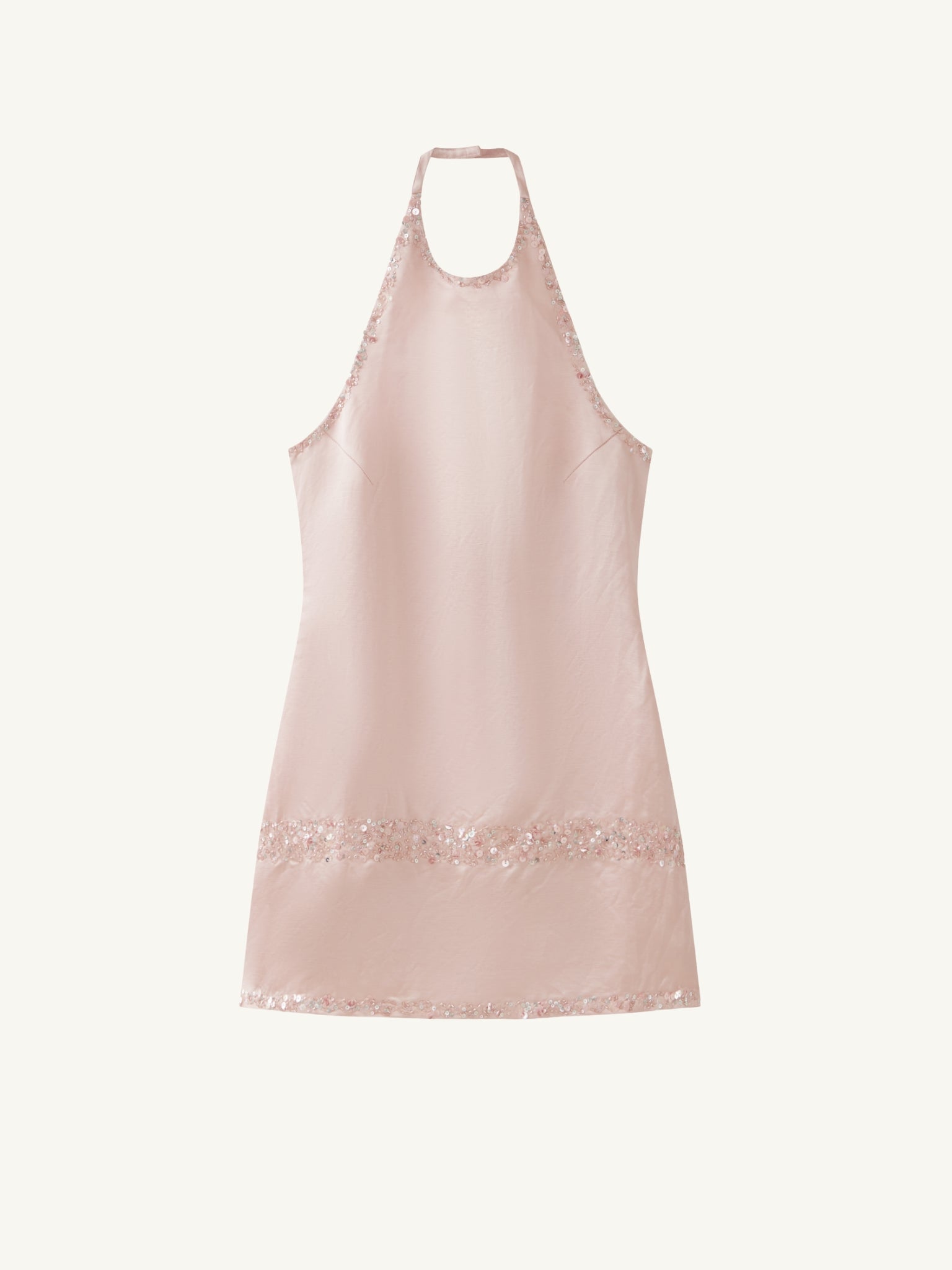 A myriad of sparking sequins and cascading beads take flight off a base of Silk Linen. Framed by embroidered trim along the halter neckline, hips and hem, finished with a concealed back zip, paying homage to ASTA’s signature sparkling identity.