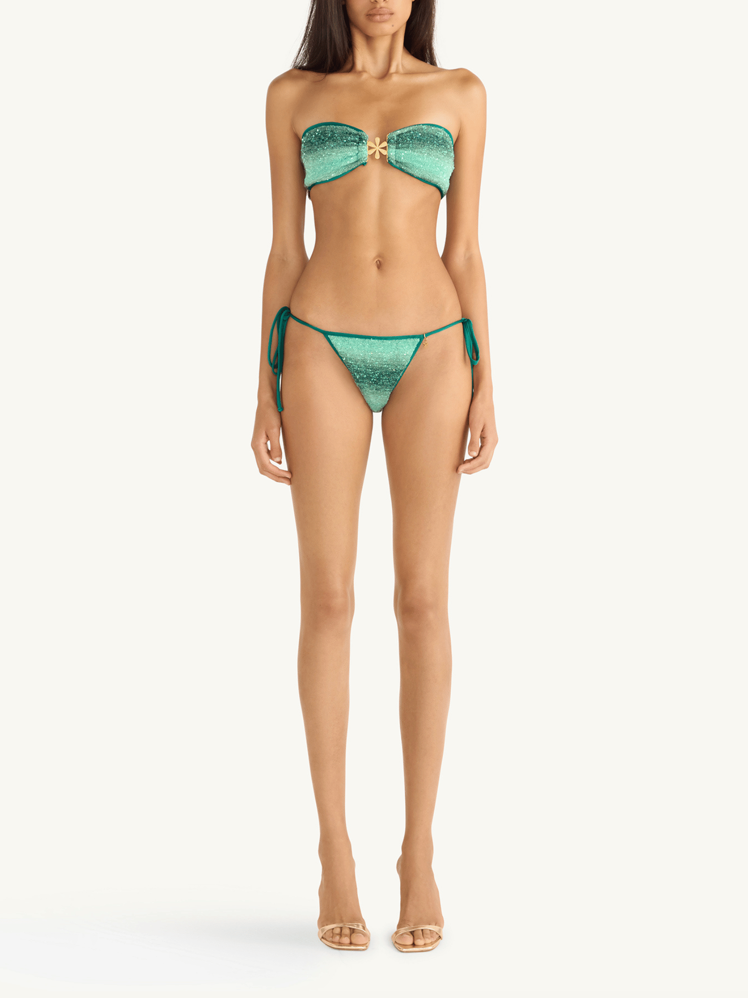 Part of our Bahéa Dream, Resort 2026 collection, the Mia Knitted Bikini Top captures the lush vibrancy of Brazil’s tropical landscape. Rendered in a radiant palm green hue, the degradé sequin finish evokes sunlight filtering through rainforest canopies and the shimmer of ocean water along the coast.