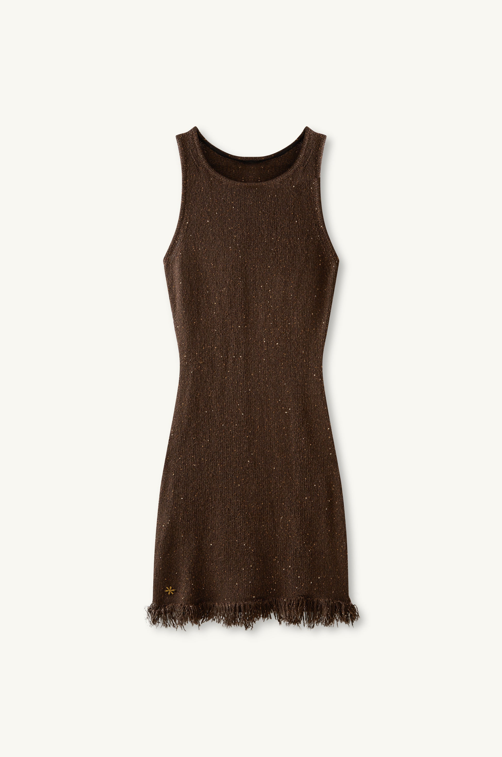 A dazzling mini-length dress designed with a fringed hem. Made from a cotton based, lustrous knit woven with micro-sequins throughout.