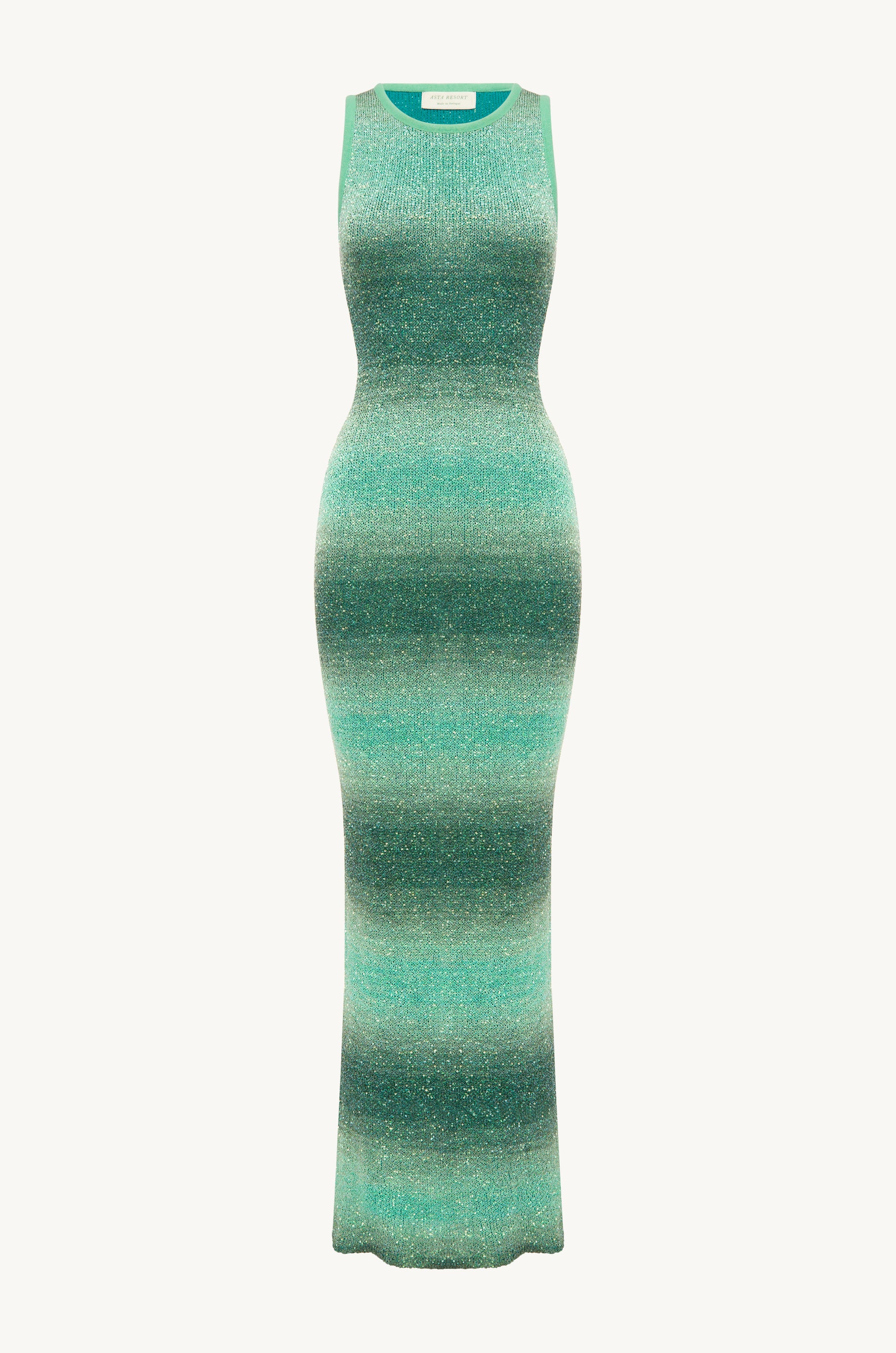 A sweeping floor-length gown showcasing a captivating ombré gradient that melts seamlessly from one soft hue to the next with its sumptuous knit fabric - delicately infused with micro-sequins, creating a refined shimmer that catches the light with every movement. Designed with a graceful scoop neckline and a sleek column silhouette, it effortlessly elongates and flatters the figure.