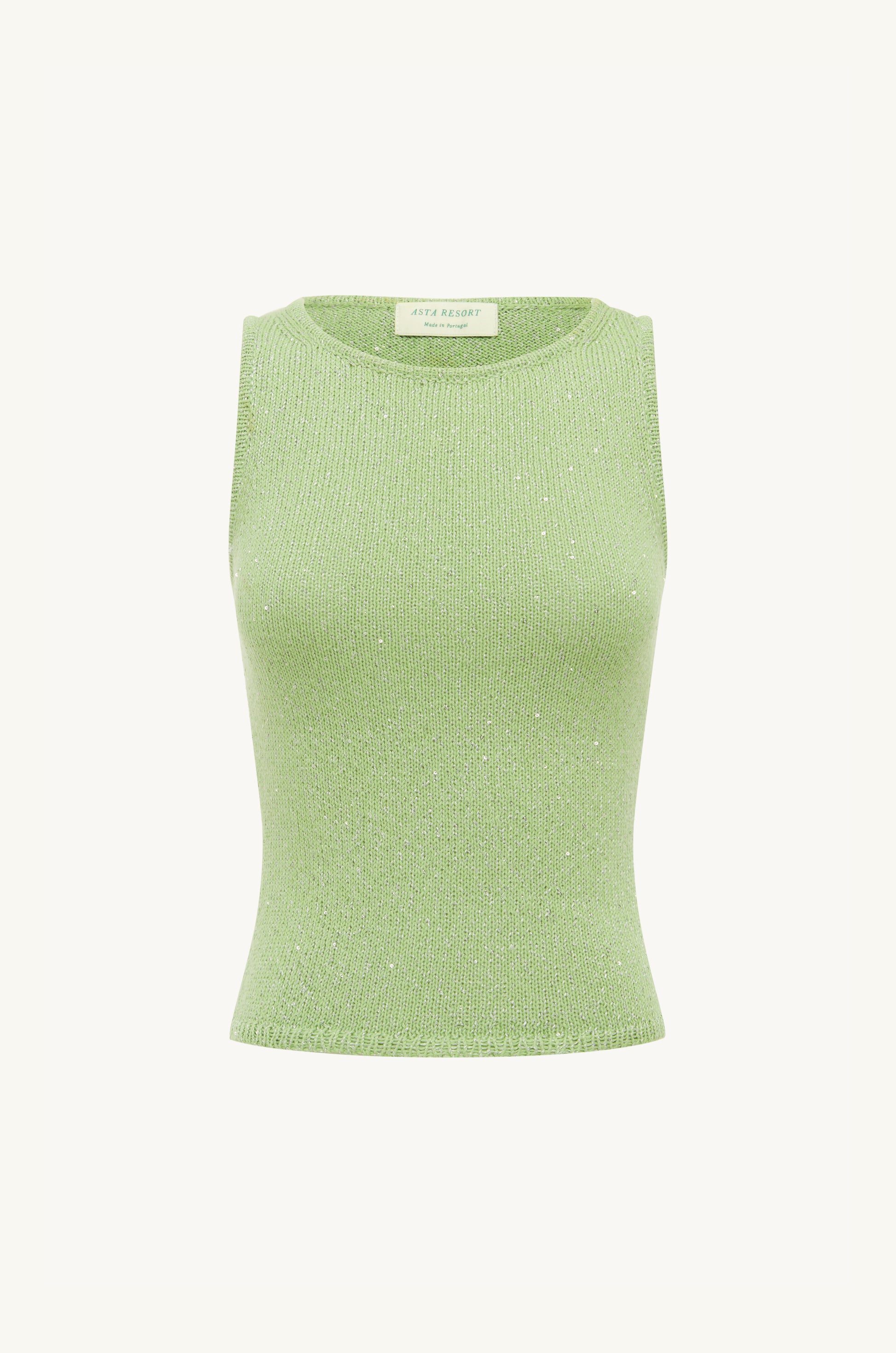 A scintillating high-neck top in a serene seafoam green, crafted from our signature cotton-based yarn and adorned with micro-sequins throughout. Its sleek silhouette and luminous finish create an effortlessly polished look.