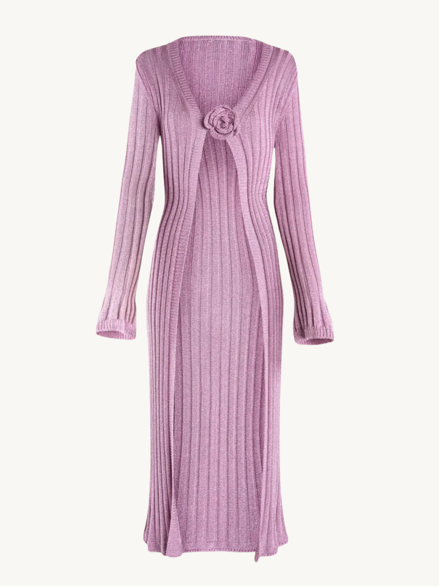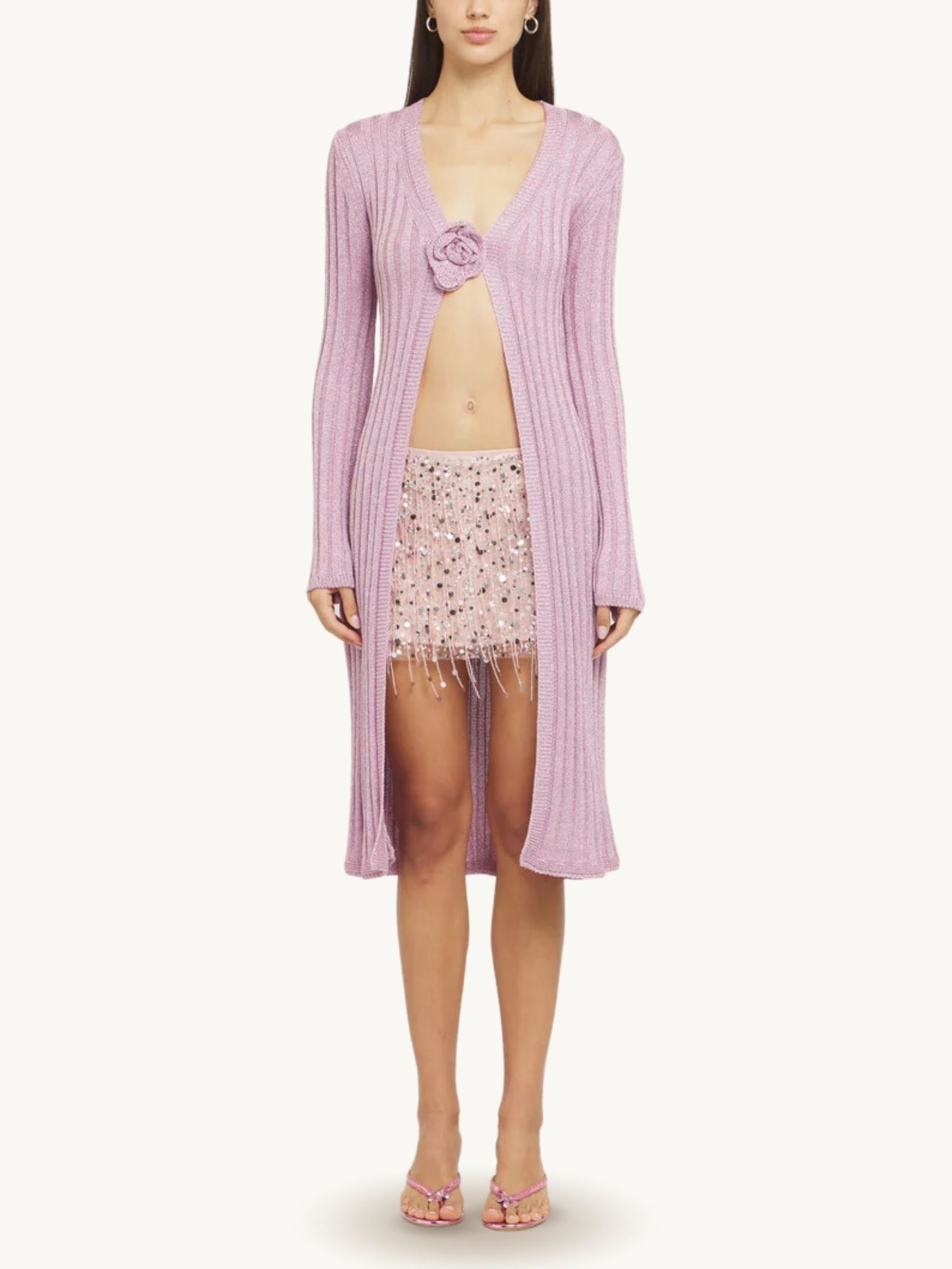 The Rosie Duster in Mauve Lurex by ASTA RESORT. A long length cardigan knitted in a scintillating lurex-componant rib, as part of the "DANCING & ROMANCING" Ready to wear collection. Complete with a hand-tricot crest flower hook and eye clasp, a signature in ASTA RESORT's knitwear.