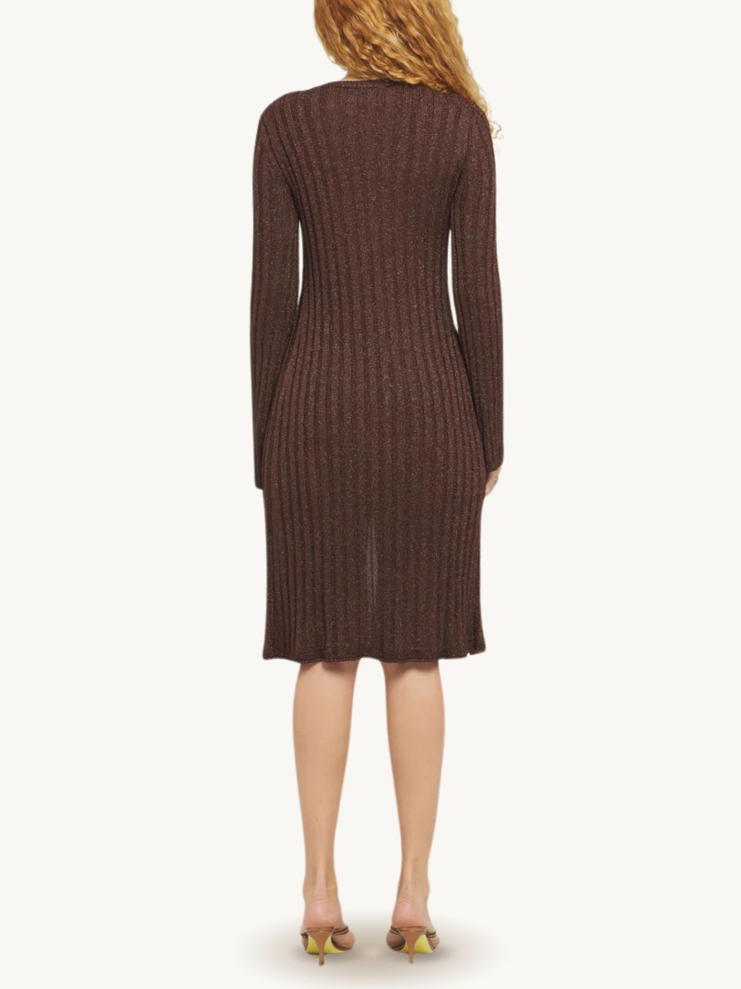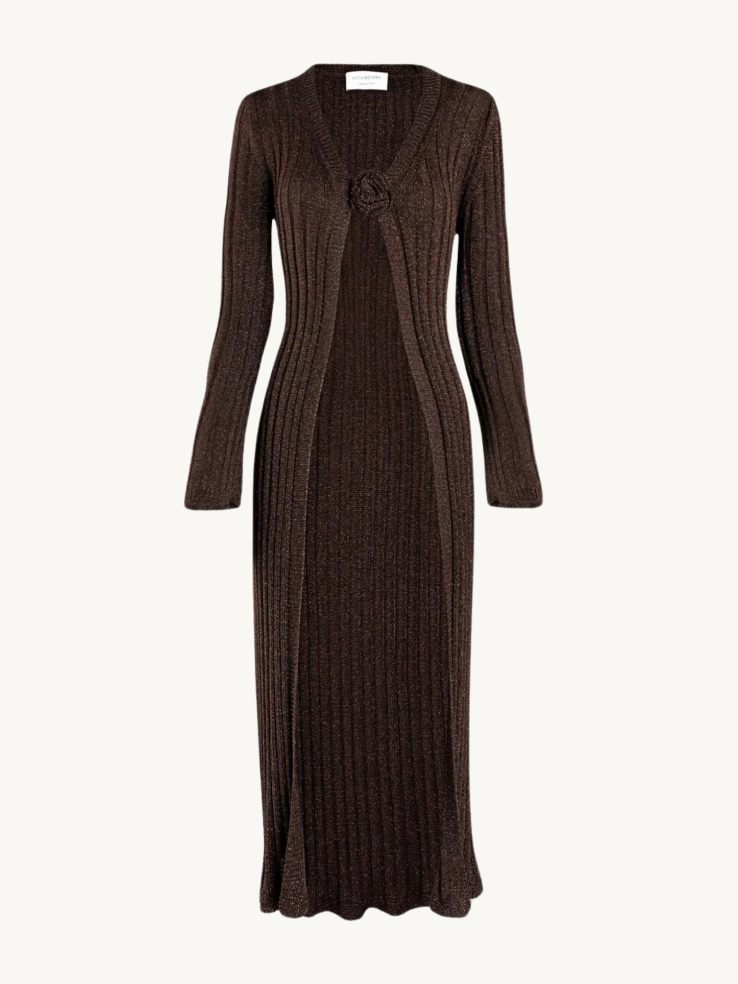 The Rosie Duster in Tobacco Lurex by ASTA RESORT. A long length cardigan knitted in a scintillating lurex-componant rib, as part of the "DANCING & ROMANCING" Ready to wear collection. Complete with a hand-tricot crest flower hook and eye clasp, a signature in ASTA RESORT's knitwear.