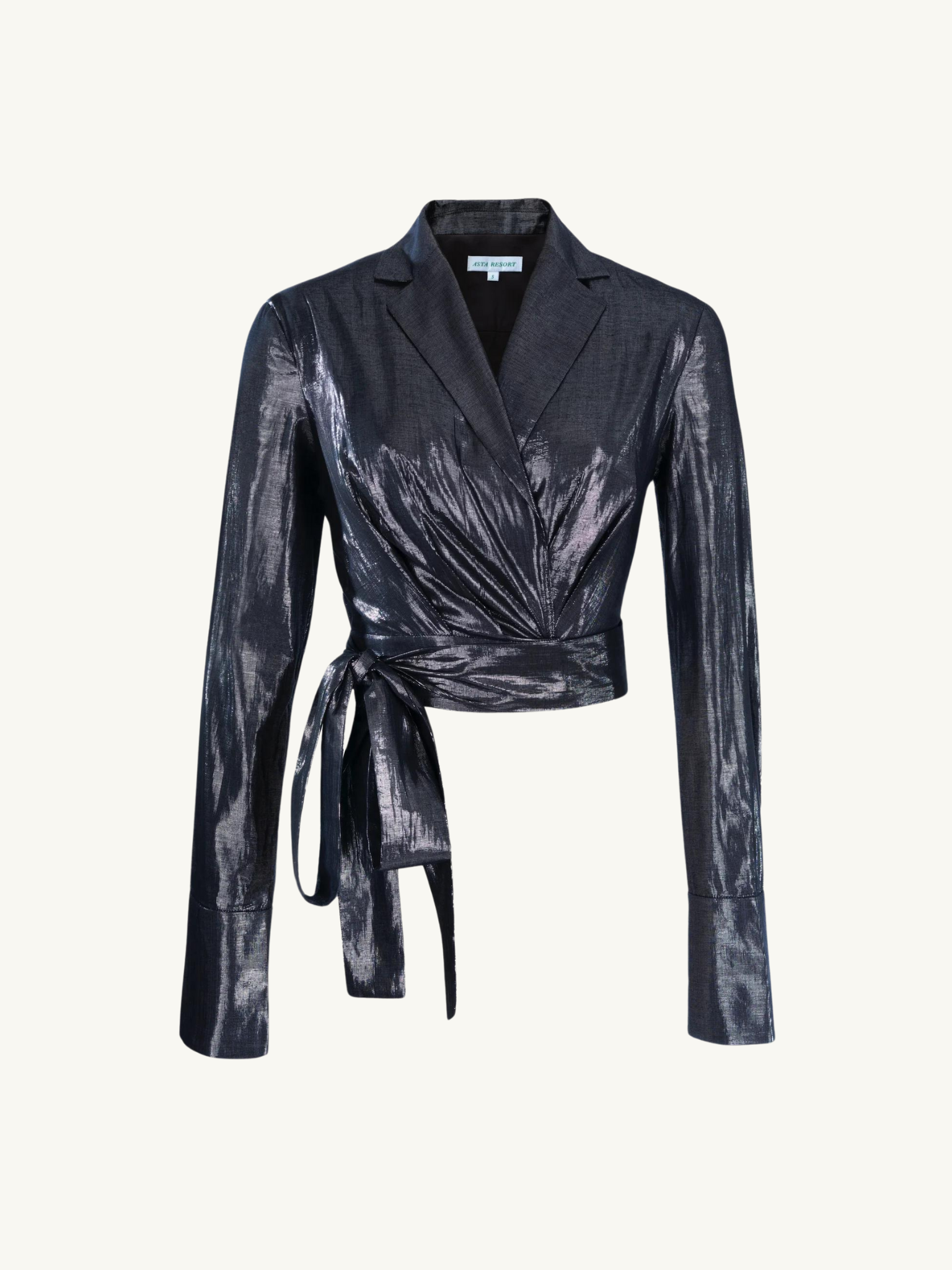 The Viola Long Sleeve Shirt by ASTA RESORT. Made from a glistening lamé cloth, this closet essential features a wrap tie waist for a flattering silhouette and a plunging collared neckline.