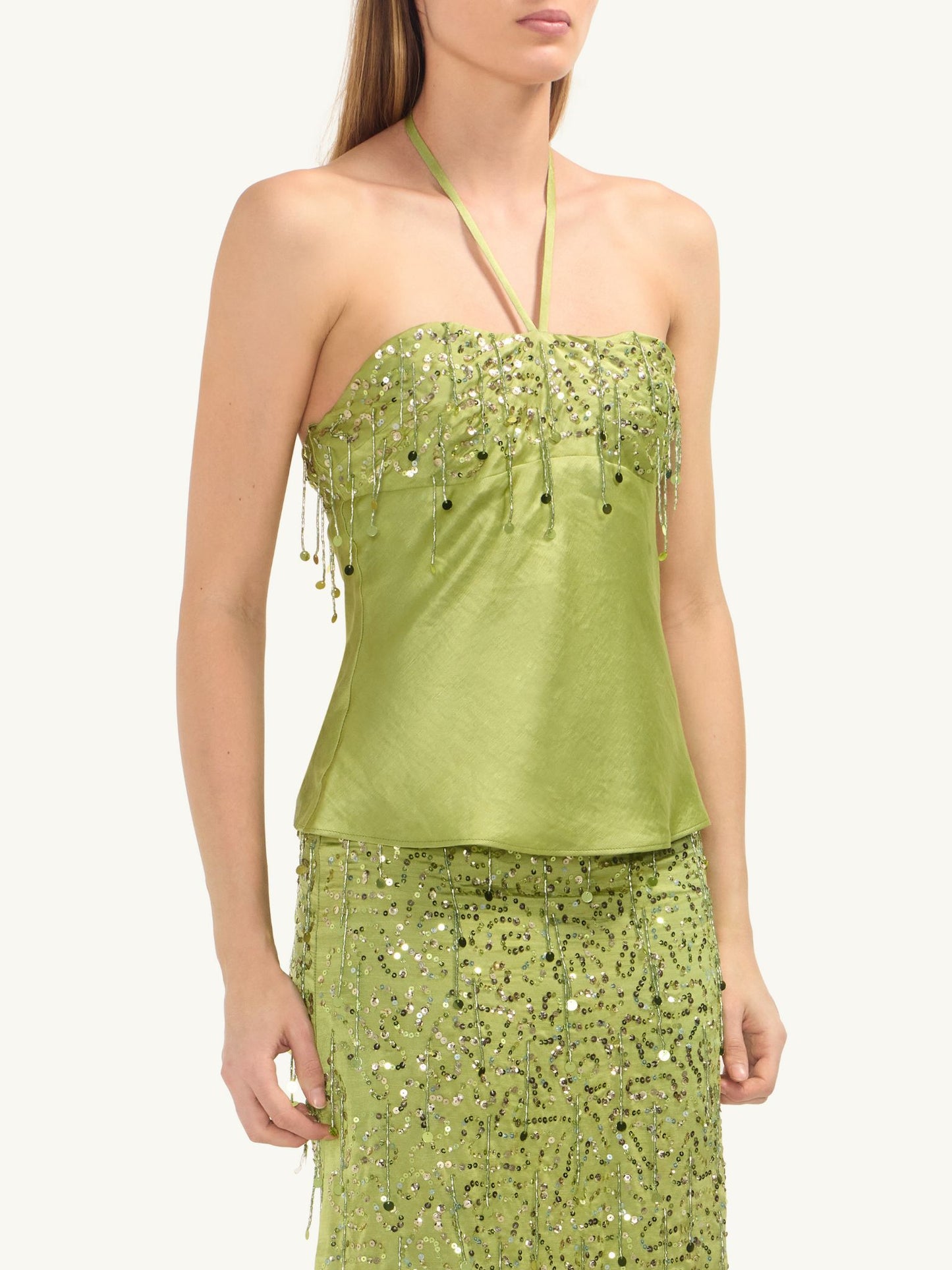 Yasmin Hand Beaded Halter Neck Top - Olive Oil